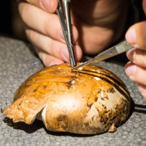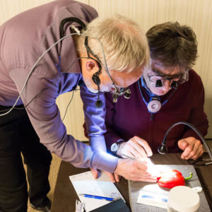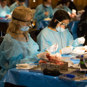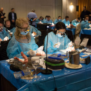 Οι συμμετέχοντες και τις δύο ήμερες μετέφεραν την θεωρία στην πράξη, μέσω ασκήσεων τομών και συρραφών, οι οποίες πραγματοποιήθηκαν σε φρέσκα λαχανικά, γνάθους και αυτιά χοίρων. Επίσης, είχαν την δυνατότητα να γνωρίσουν τον τρόπο εκμάθησης του Swiss Perio Education, αφού μέσω των πρωτοποριακών συσκευών, ο Rino Burkhardt μπορούσε να αξιολογήσει, αλλά και οι ίδιοι να εξελίξουν τεχνικές συρραφής.