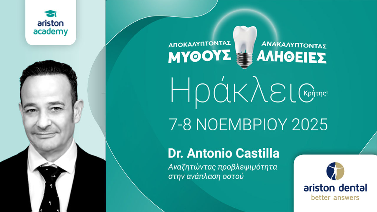 Με κεντρικό μήνυμα «Αποκαλύπτοντας μύθους, Ανακαλύπτοντας αλήθειες», το Ariston Academy υπόσχεται να φωτίσει τα σημαντικά ερωτήματα και τις σύγχρονες τάσεις στους τομείς της Αισθητικής, της Εμφυτευματολογίας και της Προσθετικής. Στο πρόγραμμα συμμετέχει για πρώτη φορά, ο διεθνώς καταξιωμένος επιστήμονας Dr. Antonio Castilla, ένας από τους επτά κορυφαίους ομιλητές του συνεδρίου.