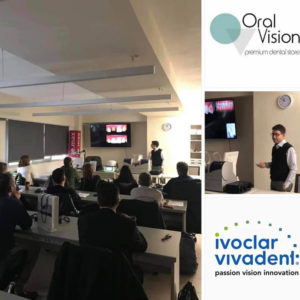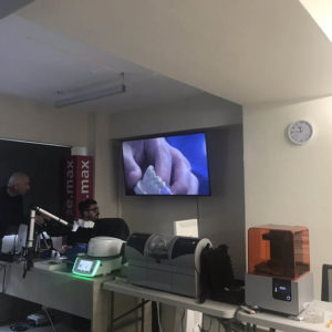 Στη συνέχεια ο Γιώργος Σιαβίκης επέδειξε σάρωση, σχεδιασμό και κοπή αποκατάστασης με το σύστημα CEREC του εργοστασίου Dentsply Sirona και κατόπιν προχώρησε με τον εκτυπωτή Form Labs. O Νίκος Συμεωνίδης εξοικοίωσε τους συμμετέχοντες με τα προϊόντα Ivoclar, τα οποία είναι διαθέσιμα για το σύστημα CEREC μέσω θεωρητικής παρουσίασης ενώ τη δεύτερη μέρα όλοι οι οδοντίατροι εξασκήθηκαν πρακτικά με το υλικό emax.