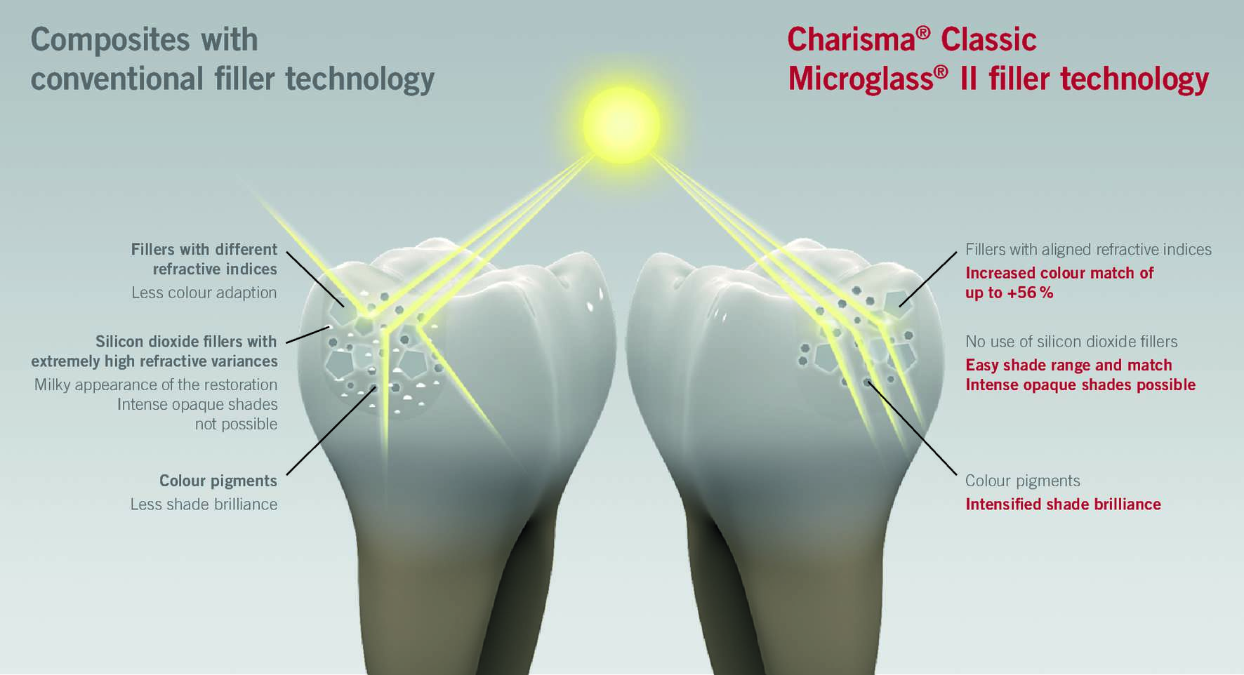 Η ρητίνη Charisma Classic είναι η πρώτη ρητίνη που προσφέρει τη δεύτερης γενιάς τεχνολογία εκδόχων Microglass. Εξελίξαμε αυτήν την τεχνολογία σε στενή συνεργασία με οδοντιάτρους παγκοσμίως, για να καλύψουμε τις απαιτήσεις σας για μια ρητίνη εύχρηστη, που αποδίδει την αισθητική και τη φωτεινότητα των φυσικών δοντιών.