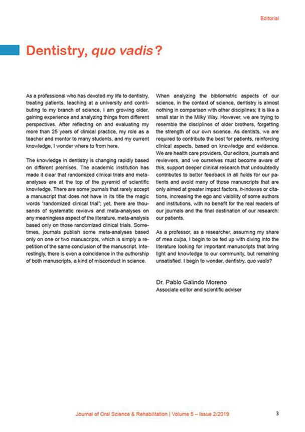 Διαβάζοντας το editorial του Dr. Pablo Galindo Moreno, τον οποίο γνωρίσαμε στην Αθήνα στο πρόσφατο SCDΣ ΙΙΙ, για το τεύχος Journal of Oral Science and Rehabilitation (Vol. 5, 2/2019), αντιληφθήκαμε την απογοήτευση του για την ποιότητα της σύγχρονης επιστημονικής έρευνας που πραγματοποιείται στην οδοντιατρική και την ένδοια σε ποιοτικά επιστημονικά άρθρα. Ο ίδιος αναρωτιέται για το πού πηγαίνει η οδοντιατρική.